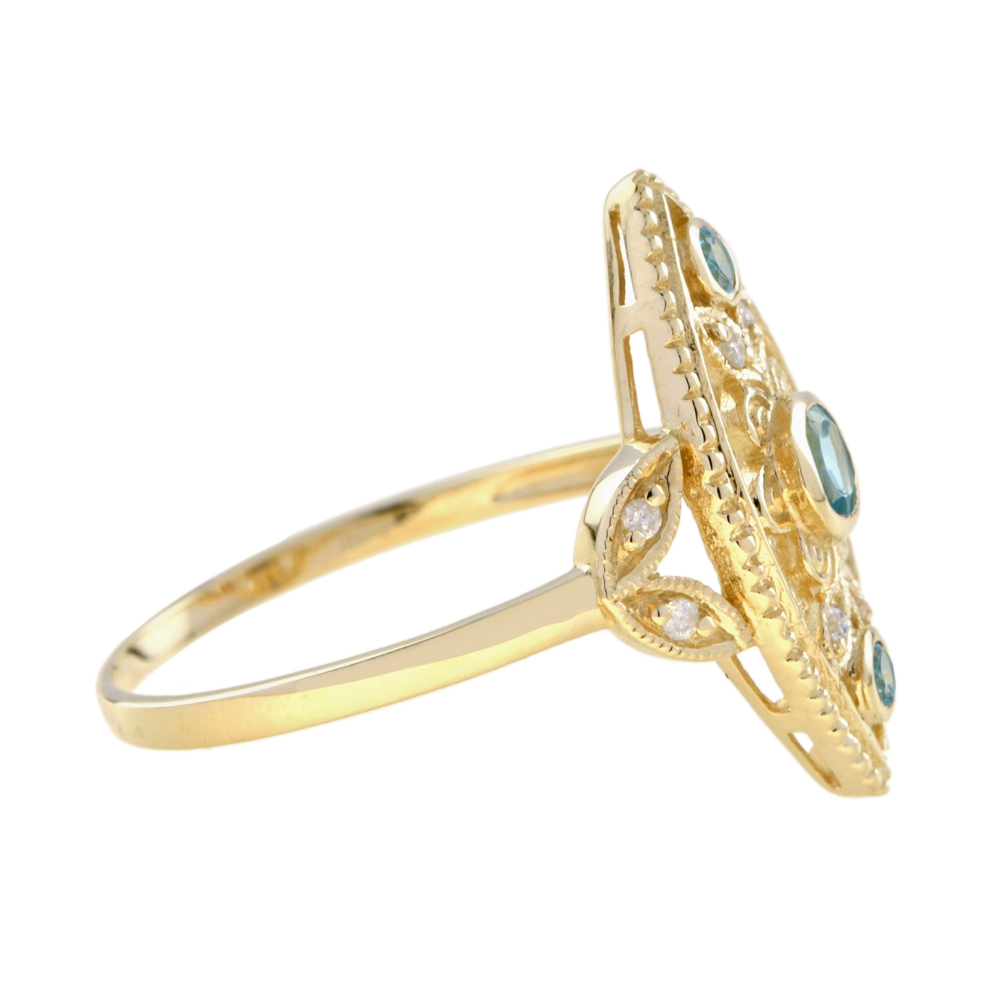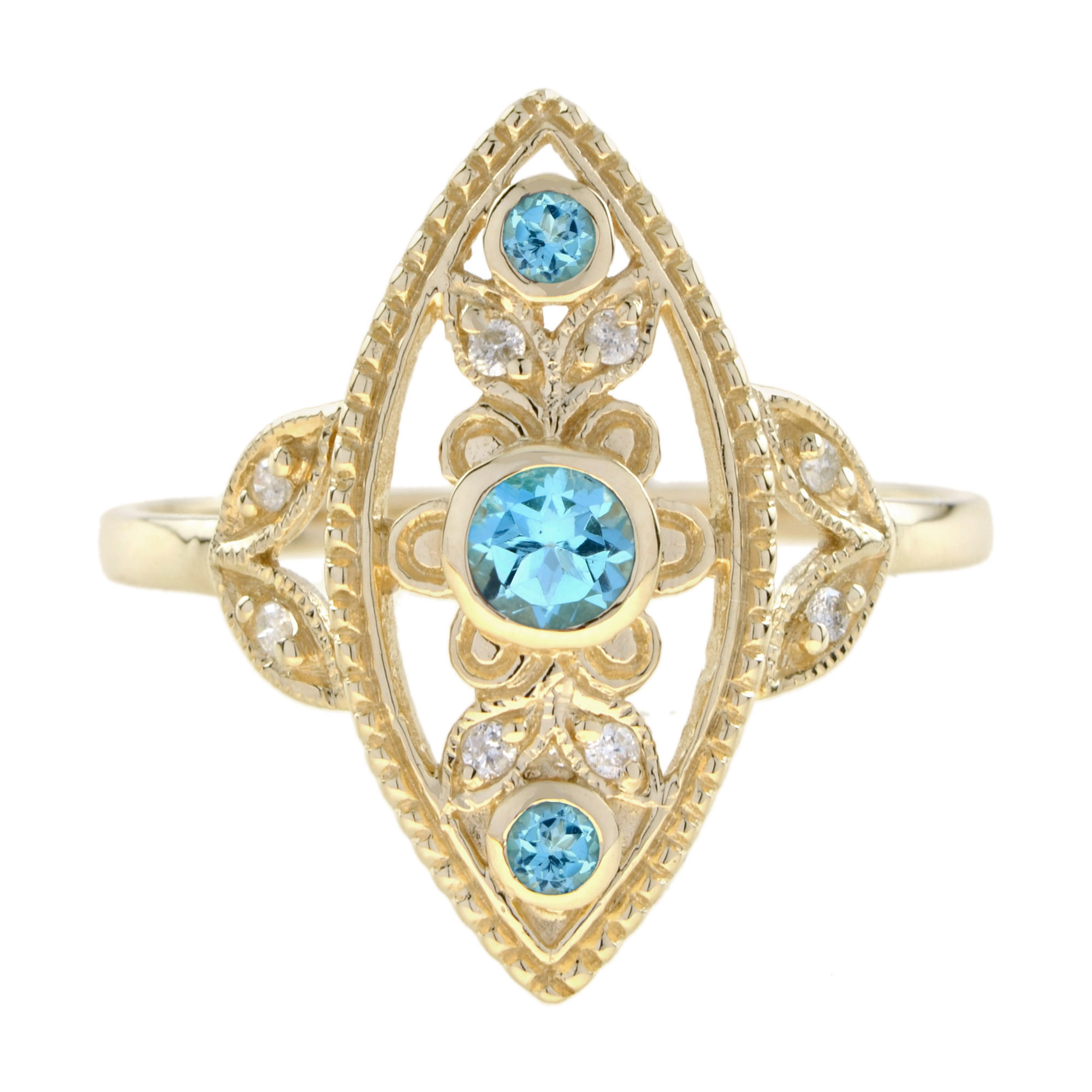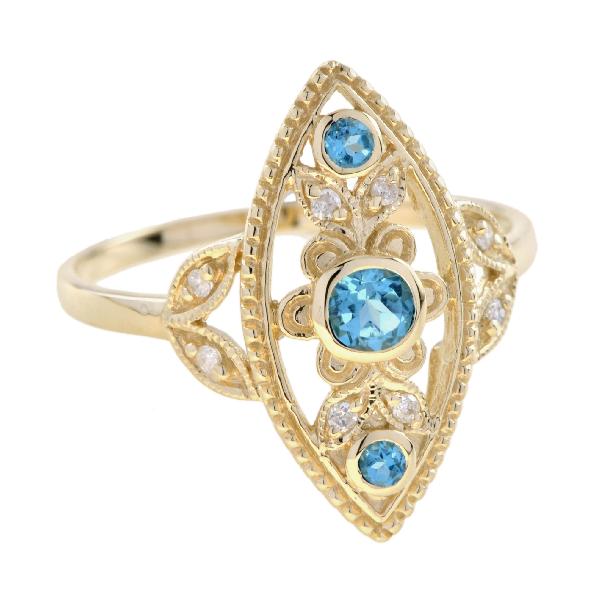 RING 9KY SWISS BLUE TOPAZ EYE, 3 ROUND SWISS BLUE TOPAZ, 8RDI=0.04PTS